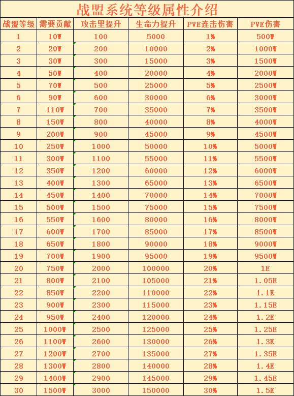 战盟等级一共30级,每升一级战盟盟主和成员增加一定属性,战盟经验全员共享,一定等级怪物可获得战盟经验